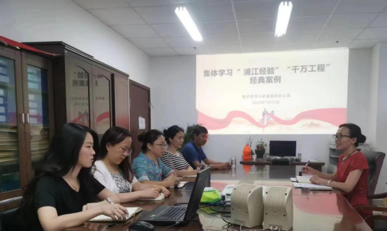 为进一步感悟习近平新时代中国特色社会主义思想的真理力量,推动主题教育走深走实,教学督导与质量监控办公室于7月19日召开主题教育专题学习会,学习“浦江经验”和“千万工程”经验案例,会议由党支部书记赵荷花主持。
