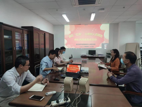 为落实党史学习教育常态化长效化要求,推进拨亮“红烛” ——立德树人育百生活动深入开展,充分发挥机关党员干部思想政治教育优势,引导青年学子铸牢理想信念,根据机关党委统一部署,教学督导与质量监控办公室党支部于4月26日下午3点在619室举办了“师生共同读党史”师生党史阅读分享会。赵荷花、崔光云、吴冰、司长玉等党员同志,结对子的“百生”团成员韩一凡、夏宇新两名同学现场参加了活动,支部党员何莹通过网络线上参加了活动。活动由党支部书记赵荷花主持。